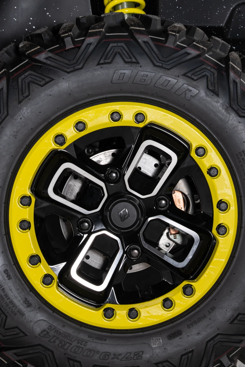 Čtyřkolka je osazena 14palcovými koly s agresivním vzorkem pro výborný záběr v terénu. Ochrana ráfků zvyšuje odolnost při průjezdu kamením nebo jinými překážkami – ideální pro náročné podmínky i sportovnější jízdu.